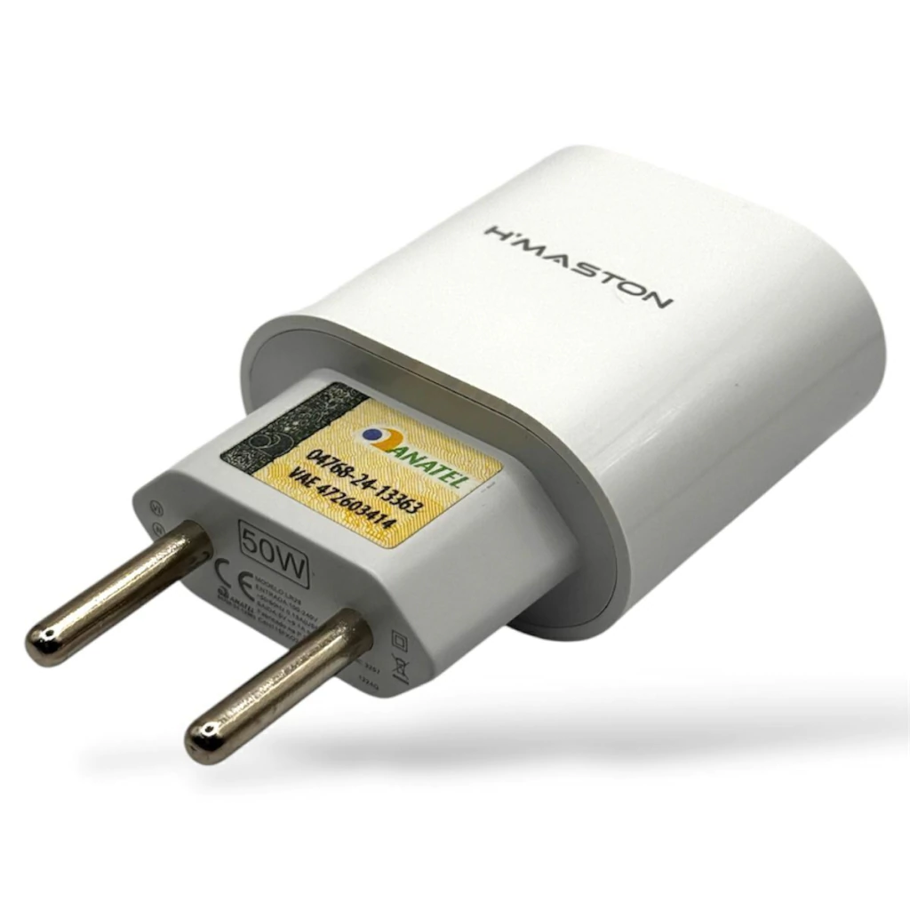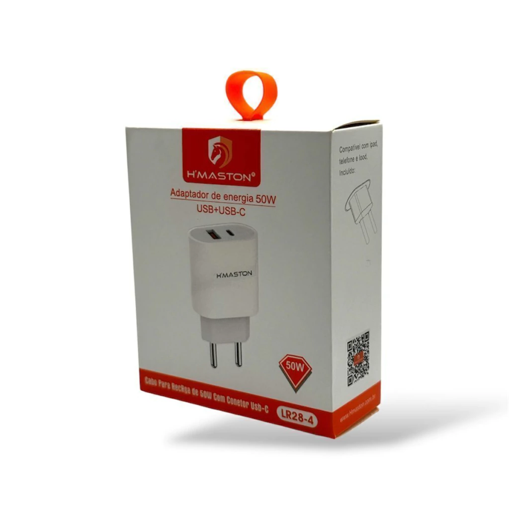O adaptador de energia H'maston modelo LR28-3 entrega até 50W de potência real, com saída USB-C de carregamento rápido, ideal para recarregar celulares, tablets e até notebooks compatíveis com alta velocidade.